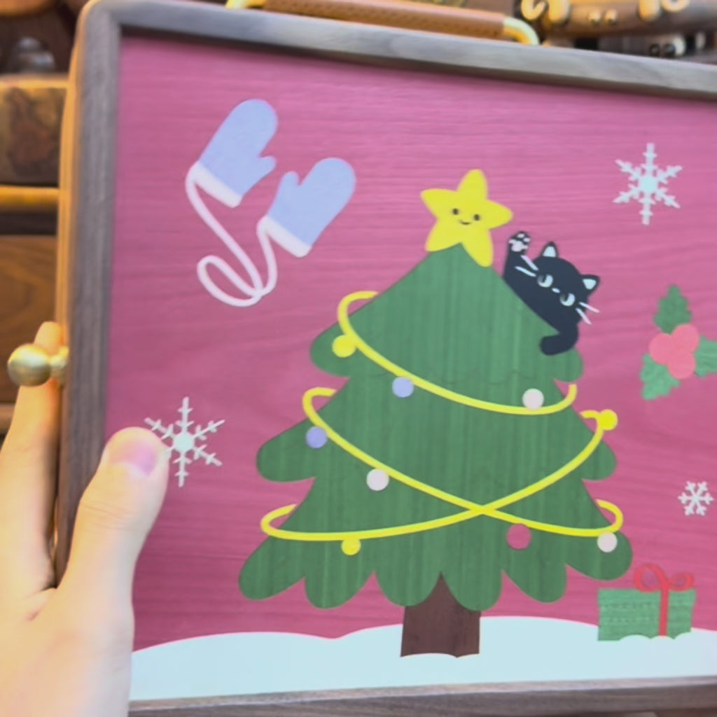 • Wood Inlay Art — Hand-laid black cat reaching for a star, crafted as a detailed wood veneer mosaic.