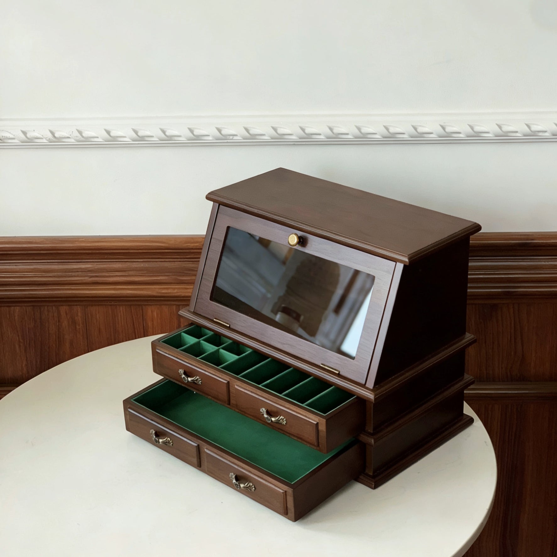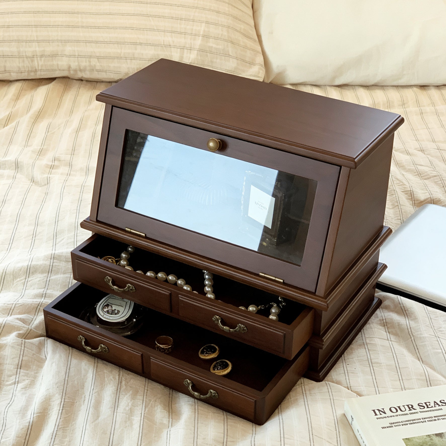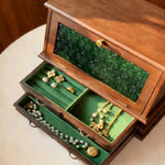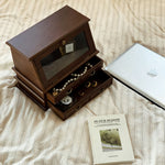 • Multi-drawer layout thoughtfully organizes rings, earrings, necklaces & keepsakes.
