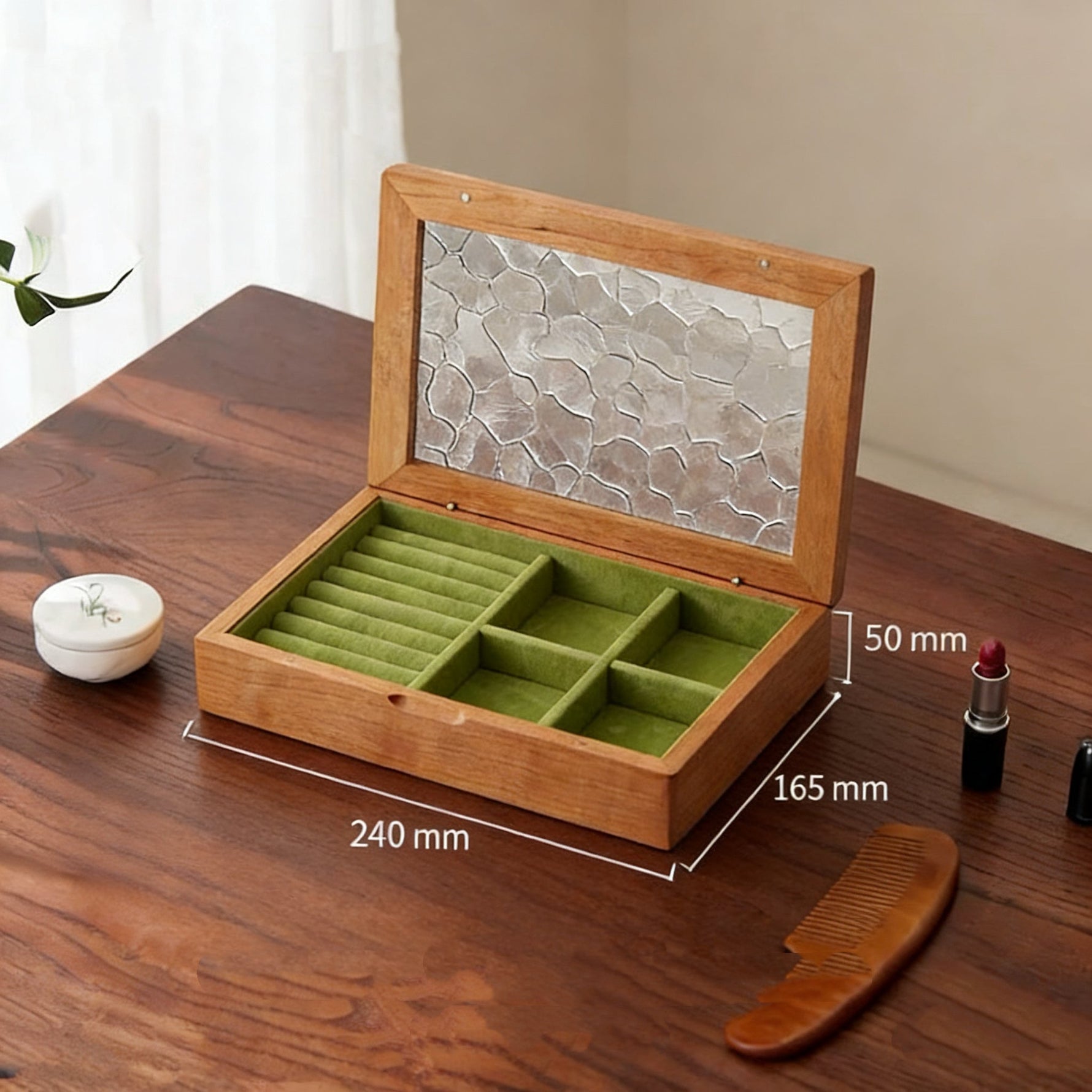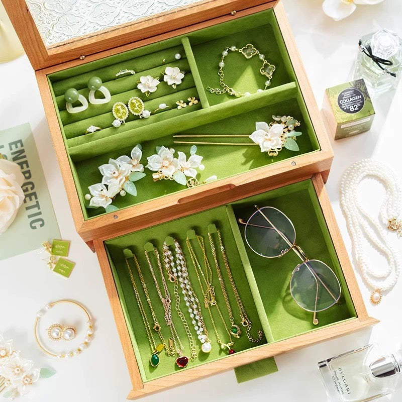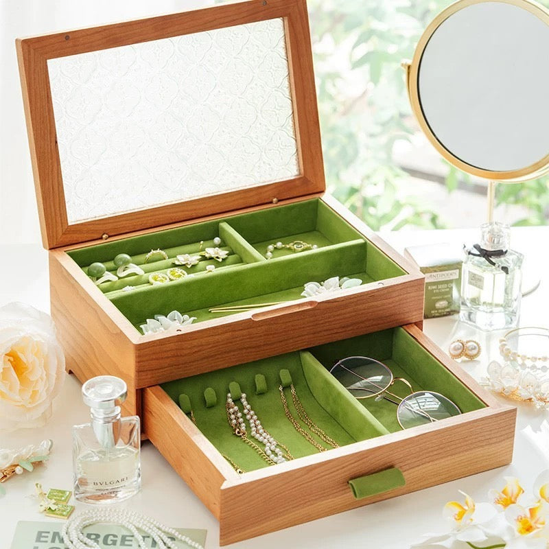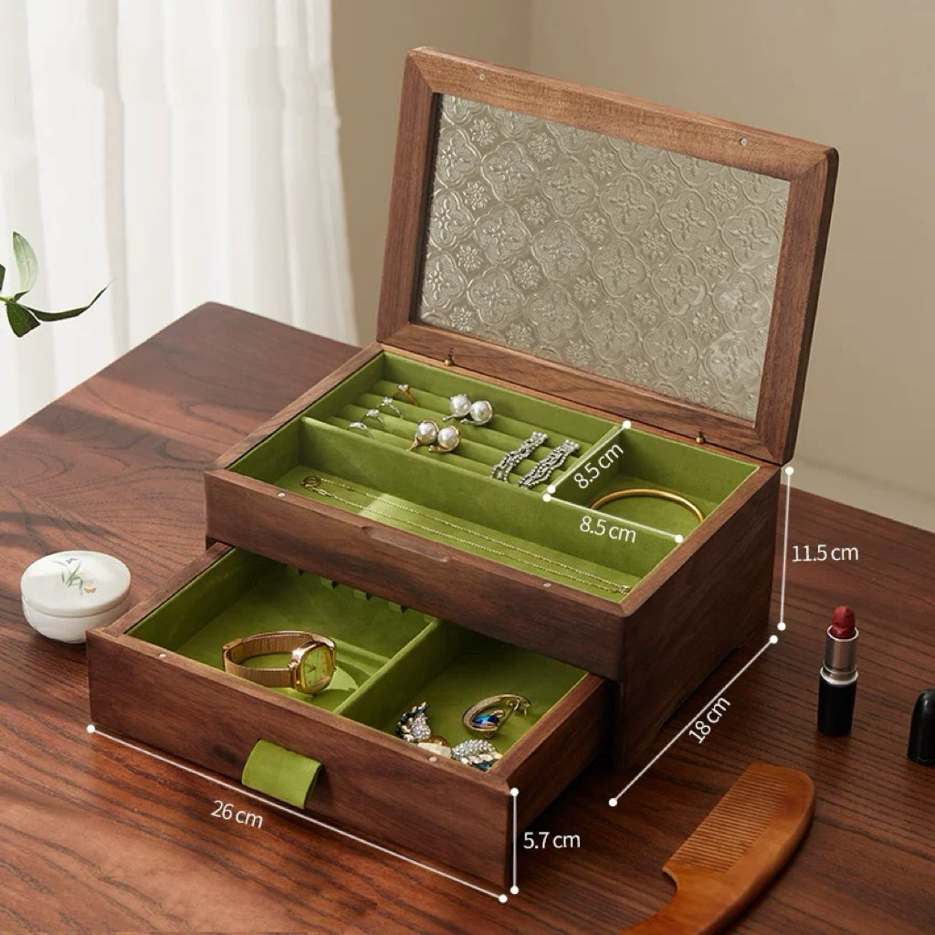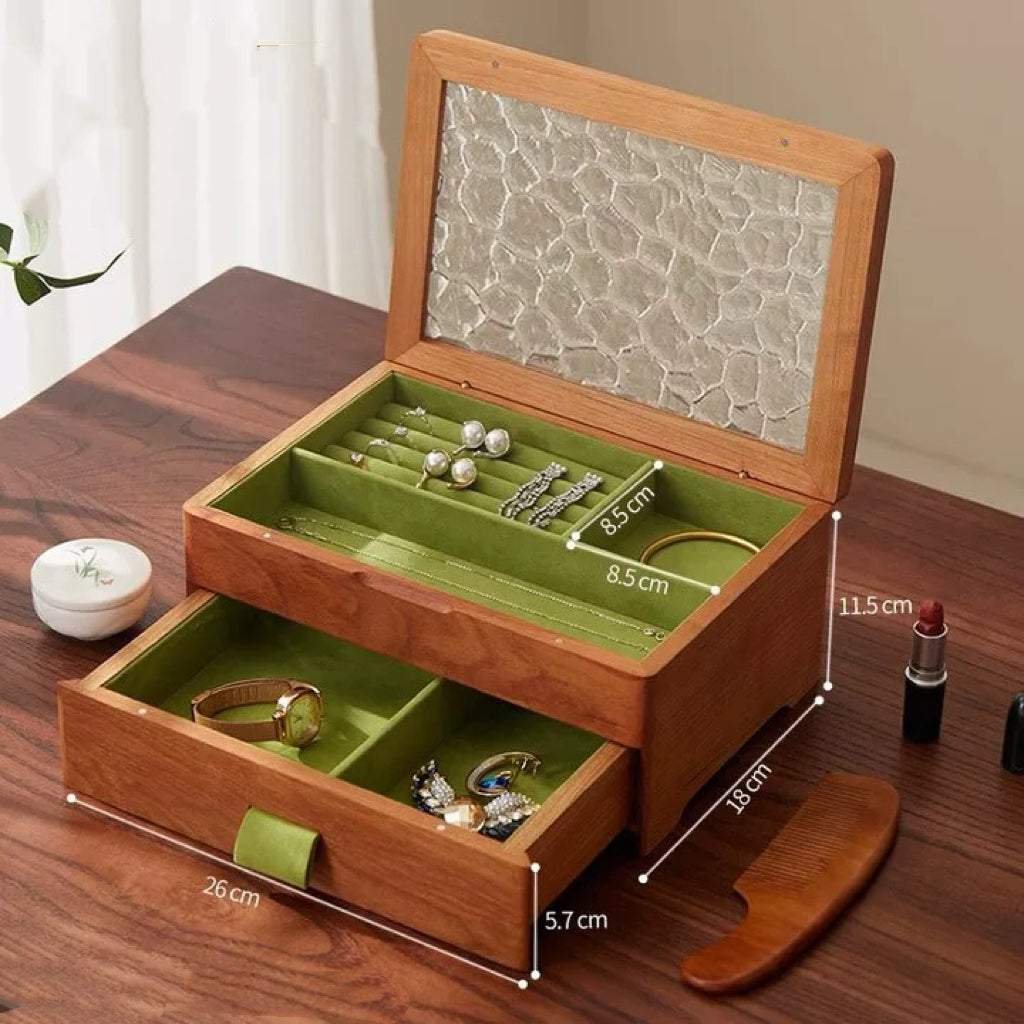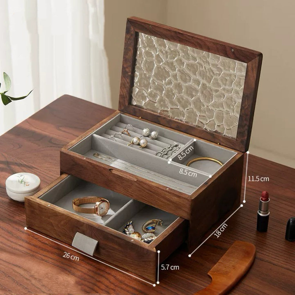 - Materials: Solid Wood + Textured Glass Lid + Soft Lined Interior