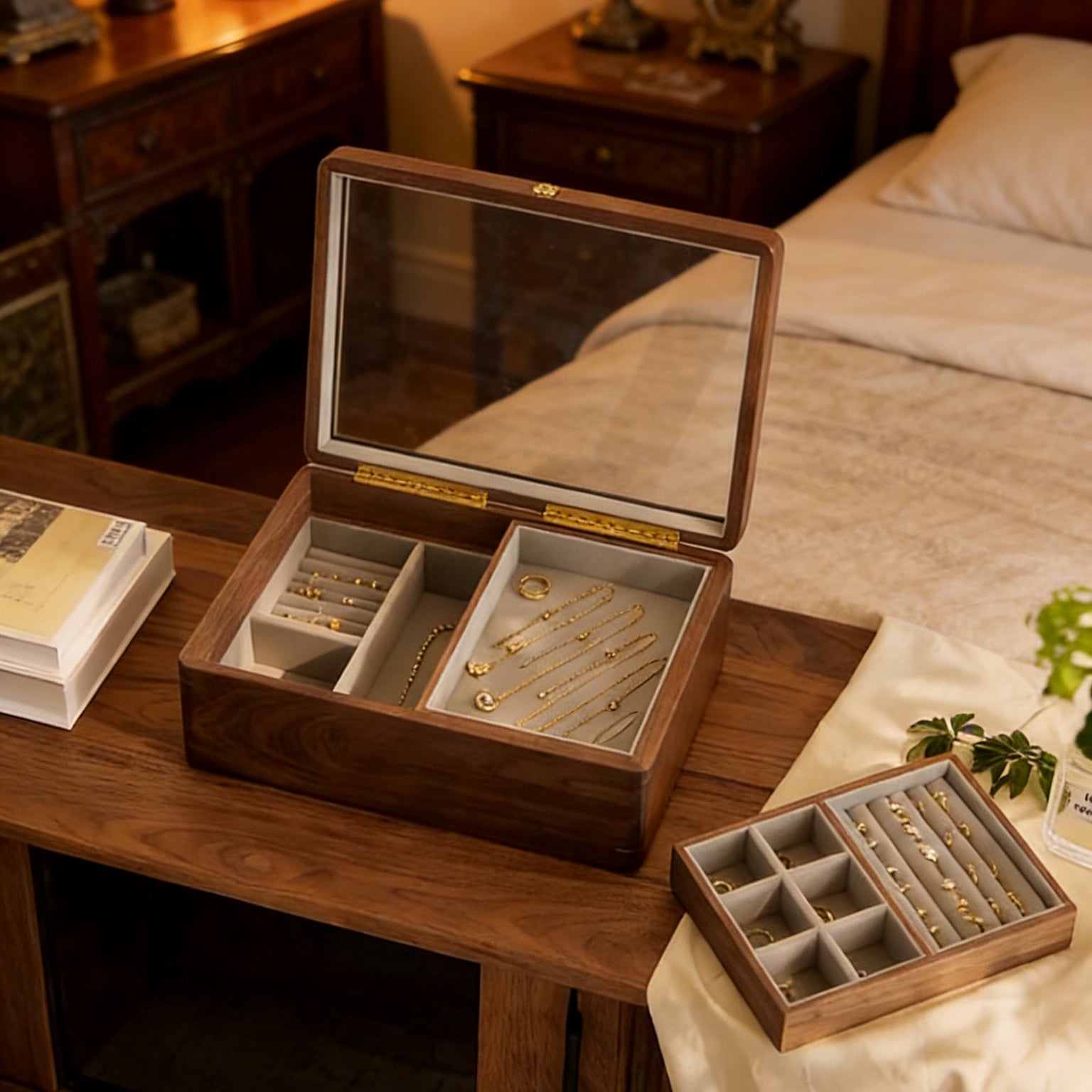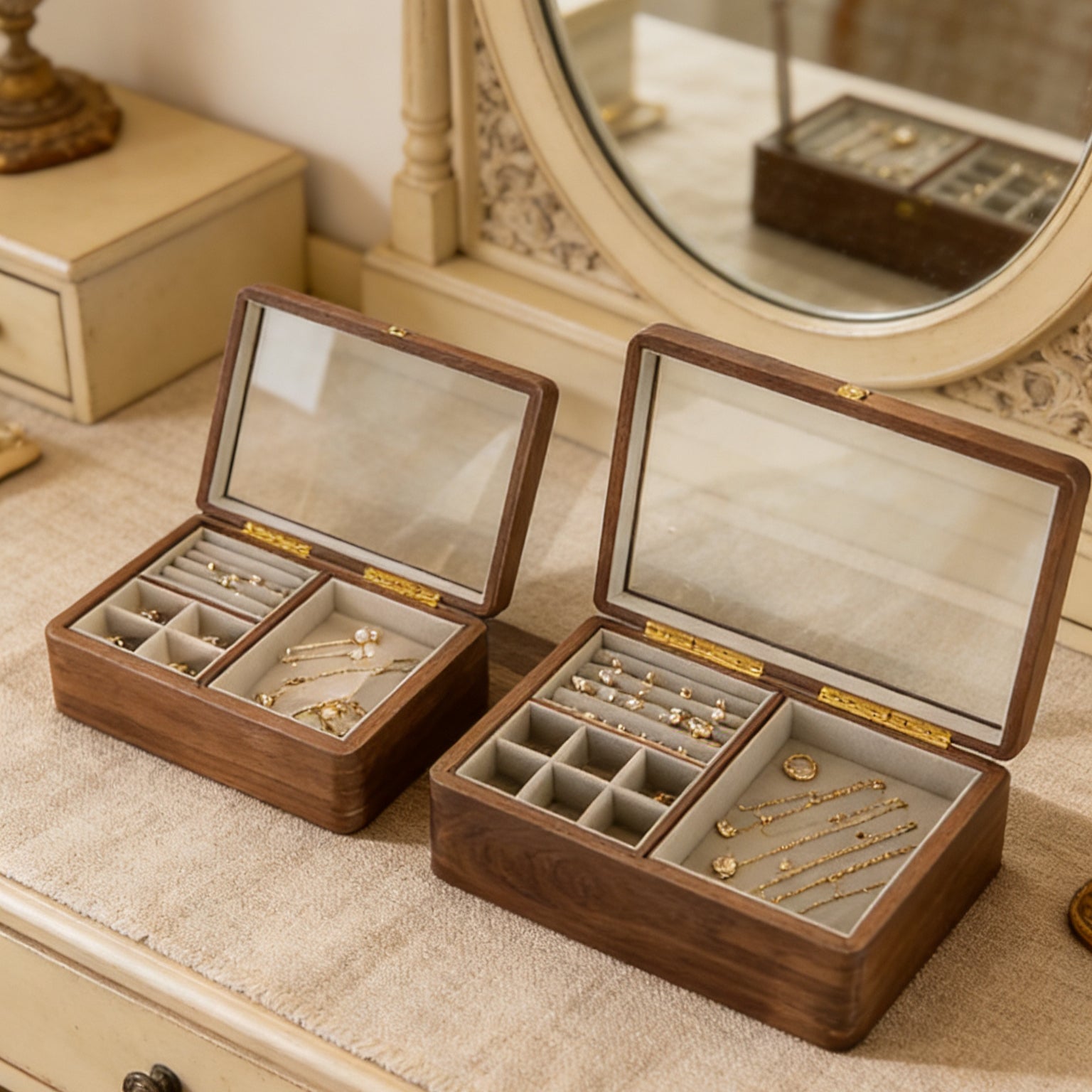 • Mit Samt ausgekleidete Fächer sorgen für eine durchdachte und übersichtliche Aufbewahrung von Ringen, Ohrringen, Armbändern und Halsketten.