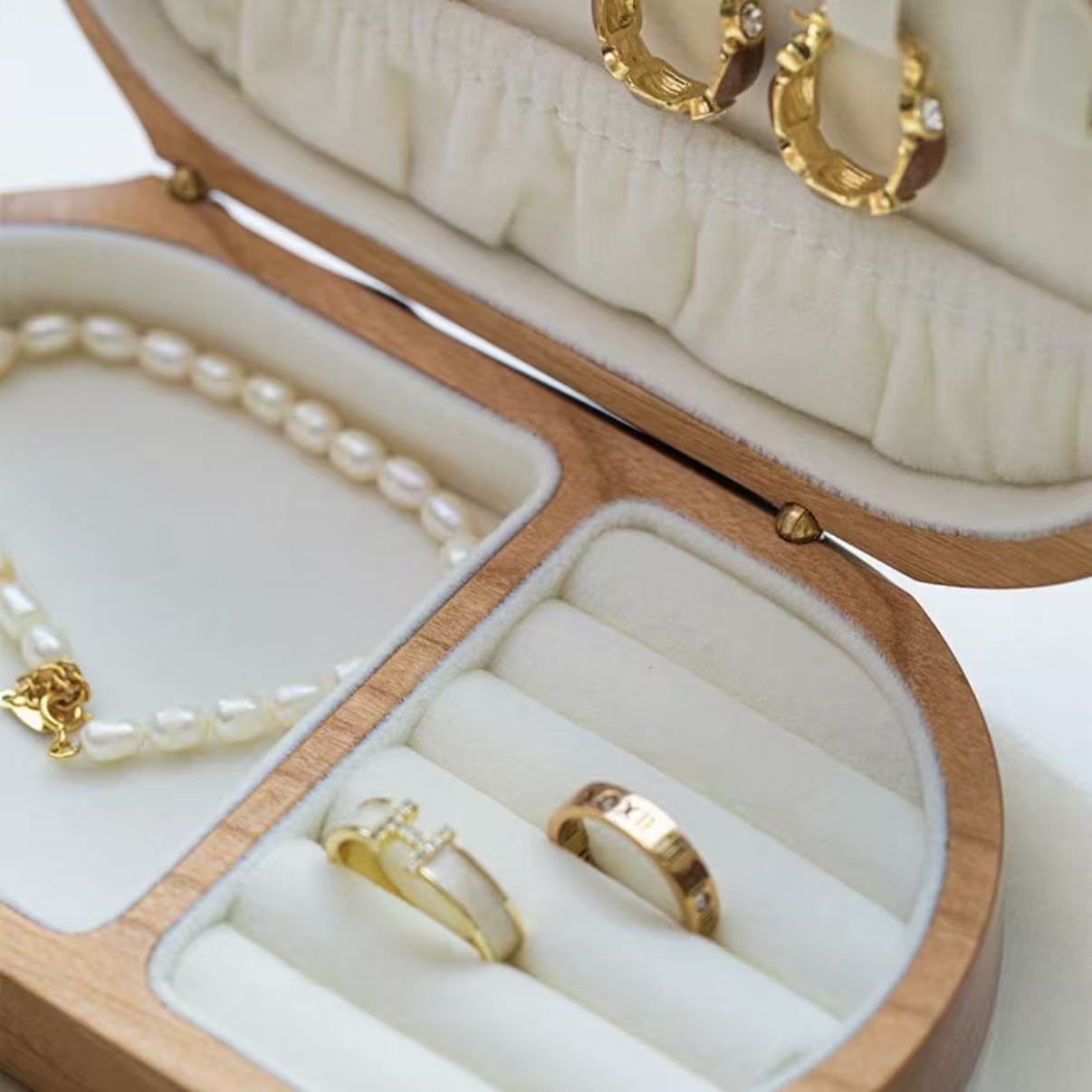 • Das speziell für Schmuck entwickelte Samtfutter schützt jedes einzelne Stück sanft, während abgerundete Ecken für eine geschmeidige, edle Haptik sorgen.