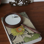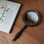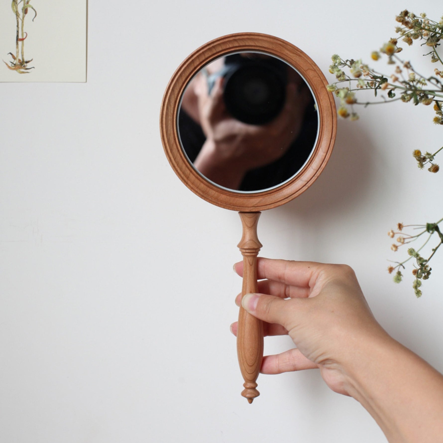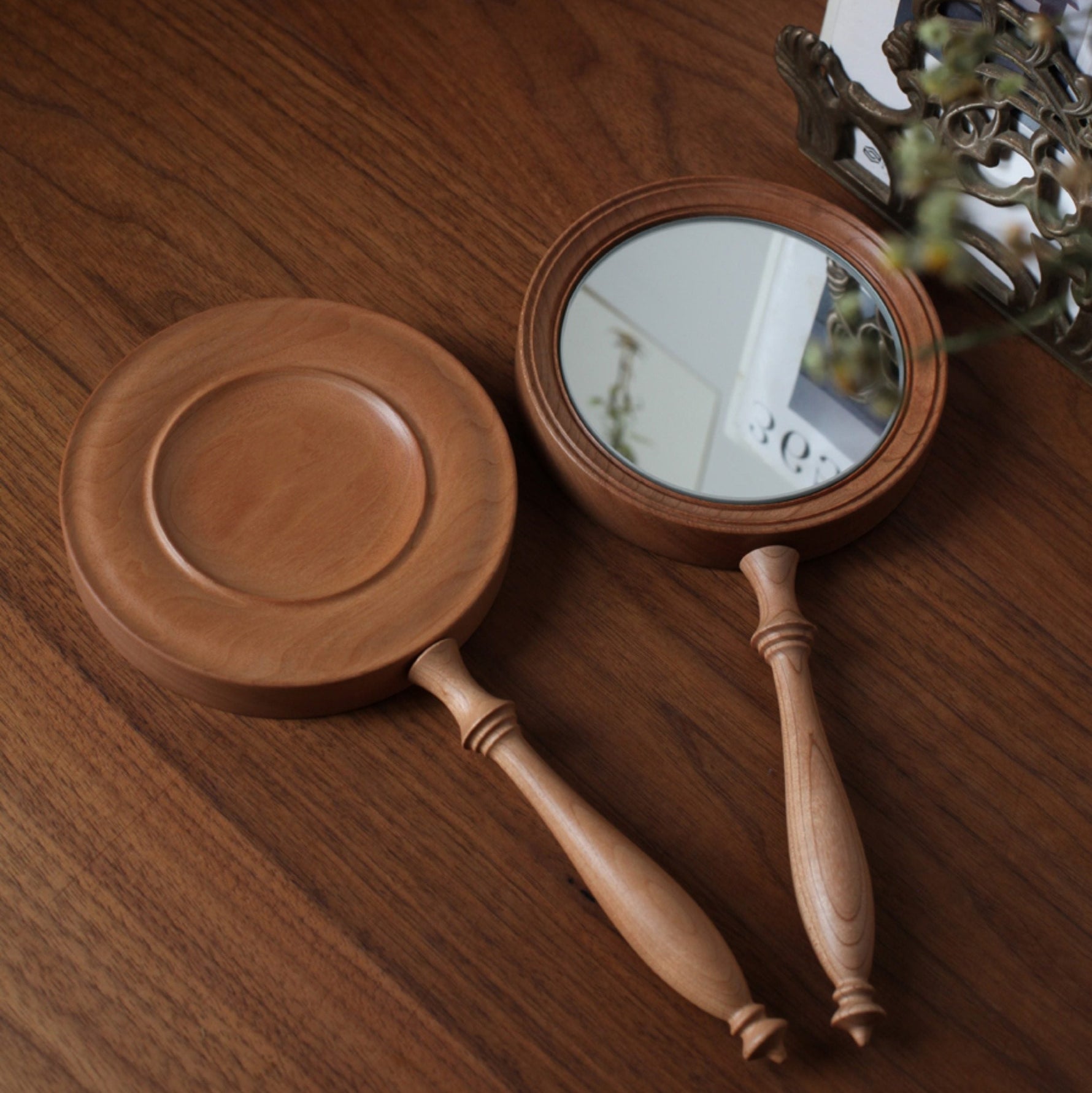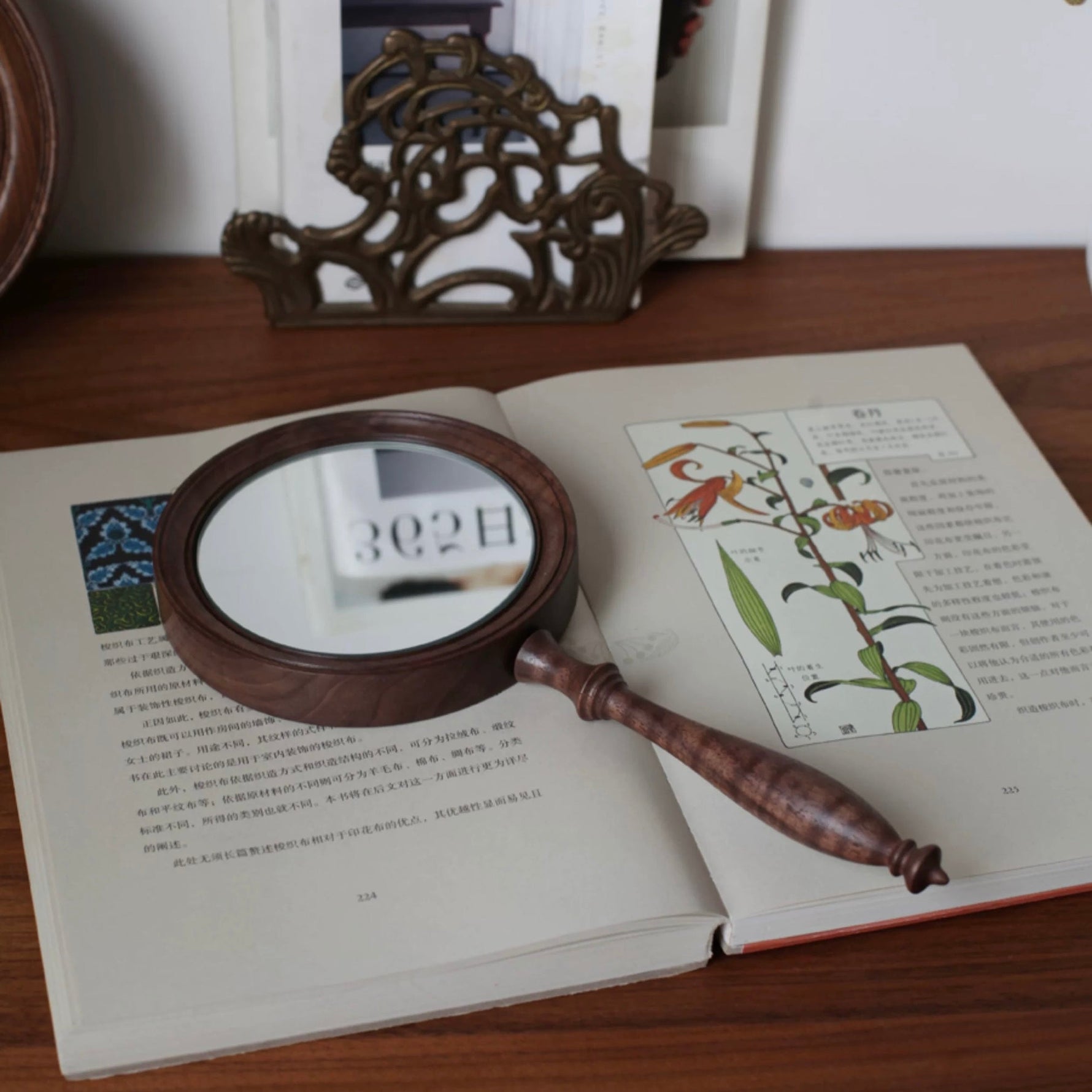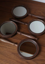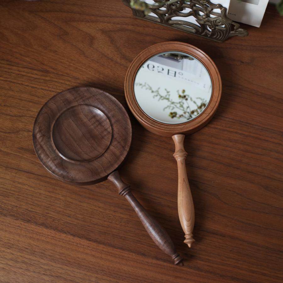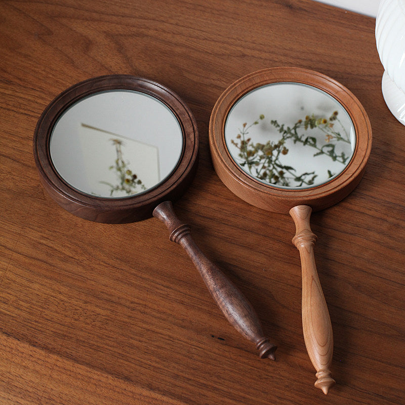 • Retro-style round mirror in a hand-carved walnut frame, blending classic charm with daily use.